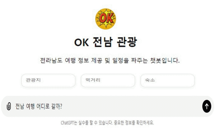 [¹Ìµð¾îÀü³² Á¦°¥´ëÁ¾ ±âÀÚ]Àü¶ó³²µµ´Â êÁöÇÇÆ¼(ChatGPT) Ȱ¿ë µµÁ¤ È«º¸¸¦ À§ÇØ ÃßÁø ÁßÀÎ Àü³² Æ¯È ÁöÇÇÆ¼ Á¦ÀÛ ¿ë¿ª ù ¹øÂ° ÇÁ·ÎÁ§Æ®·Î ¡®OK Àü³²°ü±¤¡¯ 꺿À» Á¦ÀÛ, ¿ÀÇÂAI¿¡¼ ¿î¿µ ÁßÀÎ GPT½ºÅä¾î¿¡ µî·ÏÇß´Ù°í ¹àÇû´Ù. êÁöÇÇ¡¦