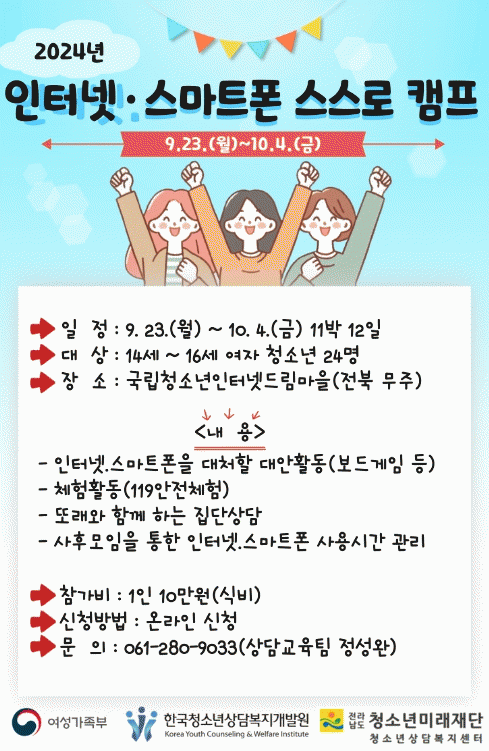 [¹Ìµð¾îÀü³² Á¦°¥´ëÁ¾ ±âÀÚ] ¿À´Â 9¿ù, Àü³² µµ³» ¿©ÀÚ Ã»¼Ò³âÀ» ´ë»óÀ¸·Î ÇÑ ÀÎÅͳݡ¤½º¸¶Æ®Æù ½º½º·Î Ä¡À¯Ä·ÇÁ(11¹Ú 12ÀÏ)¿¡ Âü¿©ÇÒ Ã»¼Ò³â ¸ðÁýÀÌ ½ÃÀ۵ƴÙ. (Àç)Àü³²Ã»¼Ò³â¹Ì·¡Àç´ÜÀº 9¿ù 23ÀϺÎÅÍ 10¿ù 4ÀϱîÁö ÁøÇàµÇ´Â ÀÎÅͳݡ¤¡¦