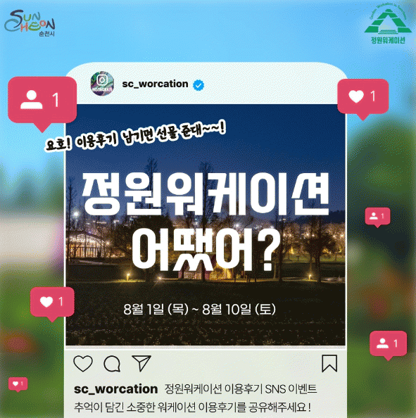 [¹Ìµð¾îÀü³² ÀÓ¼º¿Ï ±âÀÚ]¼øÃµ½Ã´Â Á¤¿ø¿öÄÉÀÌ¼Ç È«º¸¸¦ À§ÇØ ÀÔ¼Ò¹® ³»±â SNS À̺¥Æ® ¡°Á¤¿ø¿öÄÉÀÌ¼Ç ¾î¶®¾î?¡±¸¦ ÁøÇàÇÑ´Ù. À̺¥Æ®´Â 4¿ùºÎÅÍ 7¿ù±îÁö Á¤¿ø¿öÄÉÀÌ¼Ç ¼÷¹Ú°´À» ´ë»óÀ¸·Î 8¿ù 11ÀϱîÁö ÁøÇàÇϸç, Âü¿©¹æ¹ýÀº ¸ÕÀú º»ÀÎÀÇ¡¦