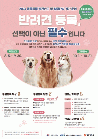[¹Ìµð¾îÀü³² Á¦°¥´ëÁ¾ ±âÀÚ]±¤ÁÖ±¤¿ª½Ã´Â ¿À´Â 5ÀϺÎÅÍ 9¿ù 30ÀϱîÁö 2°³¿ù °£ ¹Ý·Áµ¿¹° µî·Ï ÀÚÁø½Å°í ±â°£À» ¿î¿µÇÑ´Ù. 2014³âºÎÅÍ ½ÃÇàÇϰí ÀÖ´Â µ¿¹°µî·ÏÁ¦´Â 2°³¿ù·É ÀÌ»óÀÇ ¹Ý·Á°ßÀ» ¼ÒÀ¯ÇÑ °æ¿ì µ¿¹°µî·ÏÀ» Àǹ«ÈÇϰí ÀÖ´Ù. ¡¦
