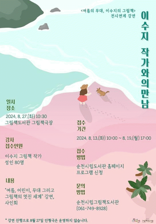 [¹Ìµð¾îÀü³² ÀÓ¼º¿Ï ±âÀÚ]¼øÃµ½Ã´Â ¿À´Â 27ÀÏ ¿ÀÀü 10½Ã 30ºÐ¿¡ ±×¸²Ã¥µµ¼°ü¿¡¼ '¿©¸§ÀÇ ¹«´ë, À̼öÁöÀÇ ±×¸²Ã¥' Àü½Ã ¿¬°è ÇÁ·Î±×·¥À¸·Î ¡°À̼öÁö ±×¸²Ã¥ ÀÛ°¡¿ÍÀÇ ¸¸³²¡±À» °³ÃÖÇÑ´Ù°í ¹àÇû´Ù. À̹ø °¿¬Àº ¡°¿©¸§, ¾î¸°ÀÌ, ¹«´ë ±×¡¦
