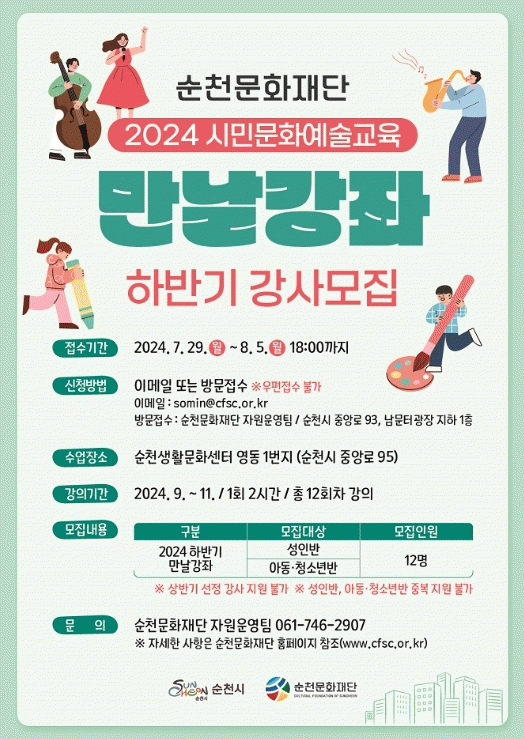 [¹Ìµð¾îÀü³² ÀÓ¼º¿Ï ±âÀÚ](Àç)¼øÃµ¹®ÈÀç´ÜÀº 8¿ù 5ÀϱîÁö ½Ã¹Î¹®È¿¹¼ú±³À° ¸¸³¯°Á ÇϹݱâ ÇÁ·Î±×·¥À» ¿î¿µÇÒ °»ç¸¦ ¸ðÁýÇÑ´Ù°í ¹àÇû´Ù. À̹ø ÇϹݱ⿡¼´Â ¼ºÀÎ, ¾Æµ¿žÃ»¼Ò³â¹