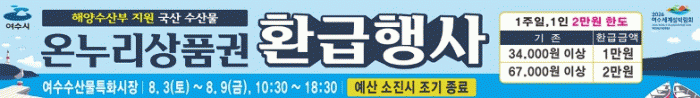 [¹Ìµð¾îÀü³² ÀüÇü¼º ±âÀÚ]¿©¼ö½Ã°¡ 8¿ù 3ÀϺÎÅÍ 9ÀϱîÁö ¿©¼ö¼ö»ê¹°Æ¯È½ÃÀå¿¡¼ ¼ö»ê¹°À» ±¸¸ÅÇÏ¸é ±¸¸Å ±Ý¾× ÃÖ´ë 30%¸¦ ¿Â´©¸®»óǰ±ÇÀ¸·Î ȯ±ÞÇÑ´Ù°í ¹àÇû´Ù. À̹ø Çà»ç´Â ¼ö»ê¹° ü°¨¹°°¡ ¾ÈÁ¤°ú ¼ö»ê¹° ¼Òºñ ÃËÁøÀ» À§ÇÑ ÇØ¾ç¼ö»êºÎ¡¦