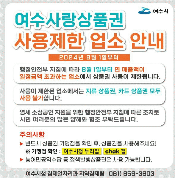 [¹Ìµð¾îÀü³² ÀüÇü¼º ±âÀÚ]¿©¼ö½Ã°¡ ¿À´Â 8¿ù 1ÀϺÎÅÍ ÀϺΠ°¡¸ÍÁ¡¿¡ ´ëÇØ ¿©¼ö»ç¶û»óǰ±Ç »ç¿ëÀ» Á¦ÇÑÇÑ´Ù°í 29ÀÏ ¹àÇû´Ù. ½Ã¿¡ µû¸£¸é ÇàÁ¤¾ÈÀüºÎÀÇ ¡®Áö¿ª»ç¶û»óǰ±Ç ¹ßÇàÁö¿ø »ç¾÷¡¯ Áöħ¿¡ µû¶ó Áö¿ªÈÆó »ç¿ëó¸¦ ¿µ¼¼ ¼Ò»ó°øÀÎ ¡¦