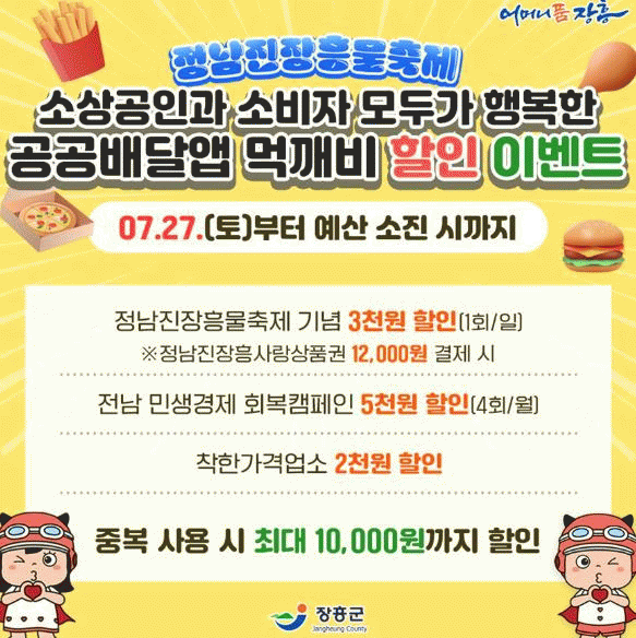 [¹Ìµð¾îÀü³² Á¦°¥´ëÁ¾ ±âÀÚ]ÀåÈﱺÀÌ Á¦17ȸ Á¤³²Áø ÀåÈï ¹°ÃàÁ¦ÀÇ ¼º°øÀû °³ÃÖ¸¦ À§ÇØ °ø°ø¹è´Þ¾Û ¸Ô±úºñ ÇÒÀÎ À̺¥Æ®¸¦ ½Ç½ÃÇÑ´Ù. À̹ø À̺¥Æ®´Â 7¿ù 27ÀϺÎÅÍ ¸Ô±úºñ ¾ÛÀ» ÅëÇØ ÀåÈï»ç¶û»óǰ±Ç 1¸¸ 2õ¿ø ÀÌ»ó ÁÖ¹® ½Ã 3,000¿ø ÇÒÀΡ¦