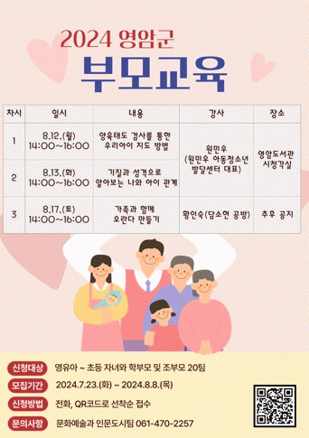 [¹Ìµð¾îÀü³² °í±Ô¼® ±âÀÚ]¿µ¾Ï±ºÀÌ ´ÙÀ½´Þ 12ÀϺÎÅÍ 17ÀϱîÁö ÁøÇàÇÏ´Â ¡®2024³â ºÎ¸ð±³À°¡¯ Âü¿©ÀÚ¸¦ 20¸íÀ» ¼±Âø¼øÀ¸·Î ¸ðÁýÇÑ´Ù. 3ȸ¿¡ °ÉÄ£ ÀÌ ±³À°Àº ¿µÀ¯¾Æ¿Í ÃʵîÇлý Àڳฦ µÐ Çкθð¿Í Á¶ºÎ¸ð°¡ Âü¿©ÇÒ ¼ö ÀÖ´Ù. 8¿ù 12ÀÏ¡¦