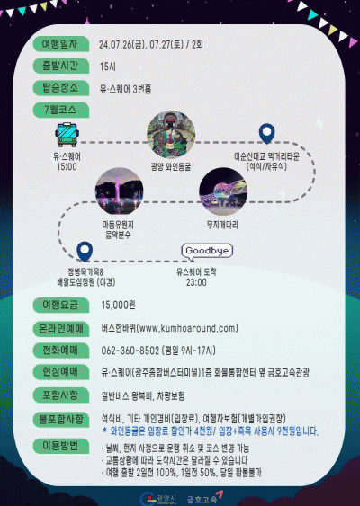 [¹Ìµð¾îÀü³² ÀÓ¼º¿Ï ±âÀÚ]±¤¾ç½Ã°¡ µµ½Ã°ü±¤(½ÃƼÅõ¾î) ±¤¿ªÄÚ½º ¡®±¤¾ç¿©Çà °¡´Â ³¯¡¯ Âü°¡ÀÚ¸¦ ¼±Âø¼ø ¸ðÁýÇÑ´Ù. ¡®±¤¾ç¿©Çà °¡´Â ³¯¡¯ÀÇ 7¿ù ÁÖÁ¦´Â ¹«´õÀ§´Â ³¯¸®°í °¨¼ºÀº ÃæÀüÇÒ ¼ö ÀÖ´Â ¡®¾ß°æ&À½¾ÇºÐ¼ö¡¯´Ù. ÃÑ 2ȸ·Î ÇÑÁ¤ ¿î¿µ¡¦