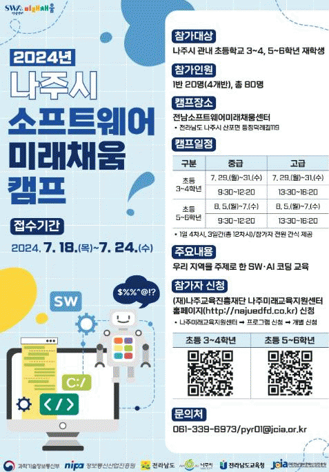 [¹Ìµð¾îÀü³² Á¦°¥´ëÁ¾ ±âÀÚ]Àü¶ó³²µµ ³ªÁֽô Áö¿ª ÃʵîÇлýµéÀÇ ¼ÒÇÁÆ®¿þ¾î(SW) ±â¼ú ÇнÀÀ» À§ÇÑ ¡®2024³â ³ªÁֽà ¼ÒÇÁÆ®¿þ¾î ¹Ì·¡Ã¤¿ò Ä·ÇÁ¡¯ Âü°¡ ÇлýÀ» ¿À´Â 24ÀϱîÁö ¼±Âø¼ø ¸ðÁýÇÑ´Ù°í 22ÀÏ ¹àÇû´Ù. (Àç)Àü³²Á¤º¸¹®È»ê¾÷ÁøÈ