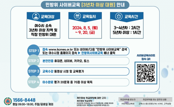 [¹Ìµð¾îÀü³² ÀüÇü¼º ±âÀÚ]¿©¼ö½Ã°¡ ¿À´Â 8¿ù 5ÀϺÎÅÍ 9¿ù 20ÀϱîÁö ¡®2024³âµµ ÇϹݱ⠹ιæÀ§´ë¿ø »çÀ̹ö 1Â÷ º¸Ãæ±³À°¡¯À» ½Ç½ÃÇÑ´Ù°í ¹àÇû´Ù. ±³À° ´ë»óÀÚ´Â ¿©¼ö½Ã¿¡ ÁÖ¼Ò¸¦ µÐ 20~40¼¼ ¹Î¹æÀ§ ´ë¿ø Áß »ó¹Ý±â ±âº»±³À°À» ¹ÌÀ̼öÇÑ 1¡¦