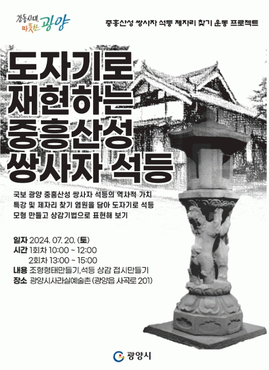 [¹Ìµð¾îÀü³² ÀÓ¼º¿Ï ±âÀÚ]±¤¾ç½Ã´Â ¿À´Â 20ÀÏ »ç¶ó½Ç¿¹¼úÃÌ¿¡¼ ¡®µµÀÚ±â·Î ÀçÇöÇÏ´Â ½Ö»çÀÚ ¼®µî¡¯ üÇè ÇÁ·Î±×·¥À» ÁøÇàÇÑ´Ù°í ¹àÇû´Ù. ±¹º¸ ±¤¾ç ÁßÈï»ê¼º ½Ö»çÀÚ ¼®µîÀº ±¤¾ç½Ã¿¡¼ ÃâÅäµÈ À¯ÀÏÇÑ ±¹º¸·Î ÀÏÁ¦°Á¡±â¿´´ø 1931³â¿¡ ¹Ý¡¦