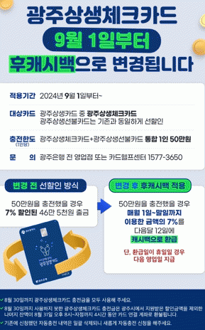 [¹Ìµð¾îÀü³² Á¦°¥´ëÁ¾ ±âÀÚ]±¤ÁÖ»ó»ýüũīµåÀÇ ÇÒÀιæ½ÄÀÌ ¿À´Â 9¿ù 1ÀϺÎÅÍ ¼± ÇÒÀο¡¼ »ç¿ë ÈÄ Ä³½Ã¹éÀ¸·Î Áö¿øÇÏ´Â ¹æ½ÄÀ¸·Î º¯°æµÈ´Ù. ±¤ÁÖ±¤¿ª½Ã(½ÃÀå °±âÁ¤)´Â ±¤ÁÖ»ó»ýüũīµåÀÇ ÇÒÀÎÁö¿ø¹æ½ÄÀÌ ÃæÀü±Ý¾×ÀÇ 7%¸¦ ÇÒÀÎÇØ Áִ¡¦