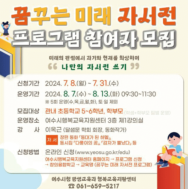 [¹Ìµð¾îÀü³² ÀüÇü¼º ±âÀÚ]¿©¼ö½ÃÇູ±³À°Áö¿ø¼¾ÅͰ¡ ¿À´Â 31ÀϱîÁö ÃʵîÇб³ 5, 6Çгâ ÇлýÀ» ´ë»óÀ¸·Î Çкθð¿Í ÇÔ²²ÇÏ´Â ¡®²Þ²Ù´Â ¹Ì·¡ ÀÚ¼Àü¡¯ ÇÁ·Î±×·¥ Âü¿©ÀÚ¸¦ ¸ðÁýÇÑ´Ù. À̹ø ÇÁ·Î±×·¥Àº ÇлýµéÀÌ °ú°Å¿Í ÇöÀ縦 µÇµ¹¾Æº¸°í ¹Ì·¡¡¦