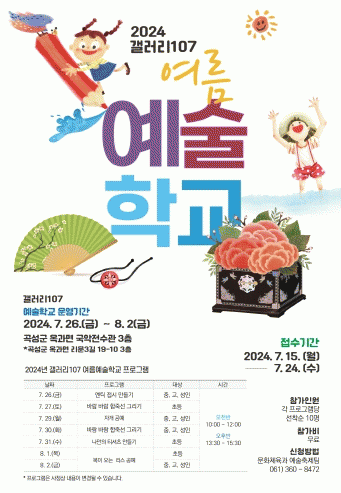 [¹Ìµð¾îÀü³² Á¦°¥´ëÁ¾ ±âÀÚ]°î¼º±ºÀº ¿À´Â 15ÀϺÎÅÍ 24ÀϱîÁö °¶·¯¸® 107 ¡®¿©¸§ ¿¹¼úÇб³¡¯ ÇÁ·Î±×·¥ Âü°¡ÀÚ¸¦ ¸ðÁýÇÑ´Ù°í ¹àÇû´Ù. °¶·¯¸® 107Àº °î¼ºÀ¾ Áß¾Ó·Î 107-1¿¡ À§Ä¡Çϰí ÀÖÀ¸¸ç Áö¿ª ÁÖ¹ÎÀÇ ¹®È ÇâÀ¯¿Í ¿¹¼úÀû ¼ºÃë°¨À» ´À³¢¡¦