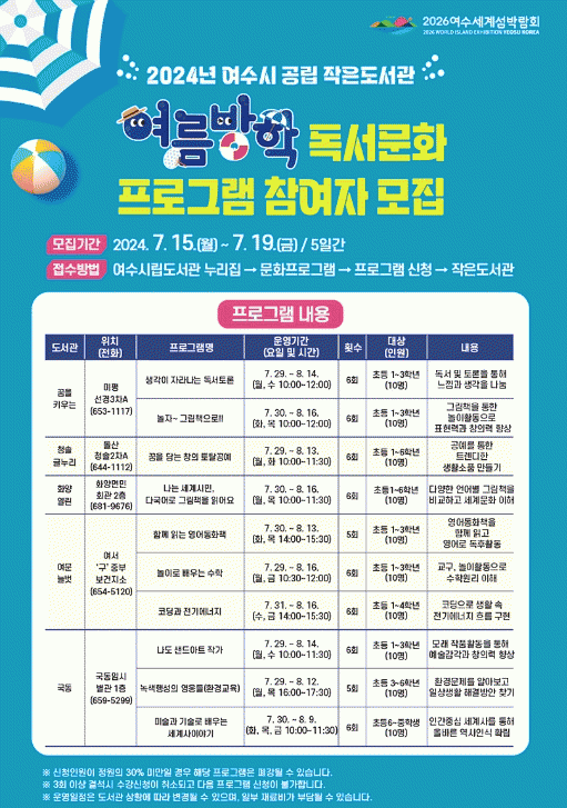 [¹Ìµð¾îÀü³² ÀüÇü¼º ±âÀÚ]¿©¼ö½Ã°¡ ¿î¿µÇÏ´Â °ø¸³ ÀÛÀºµµ¼°ü 5°³¼Ò¿¡¼ ¡®2024³â ¿©¸§¹æÇÐ µ¶¼¹®È ÇÁ·Î±×·¥¡¯ Âü¿©ÀÚ¸¦ ¸ðÁýÇÑ´Ù. À̹ø ÇÁ·Î±×·¥Àº ¹æÇÐ ±â°£À» ¸Â¾Æ ÇлýµéÀÌ µ¶¼ ½À°üÀ» ±æ·¯ âÀǷ¡¤»ç°í·ÂÀ» Çâ»ó½ÃŰ°í ¹®È»ýȰ¡¦