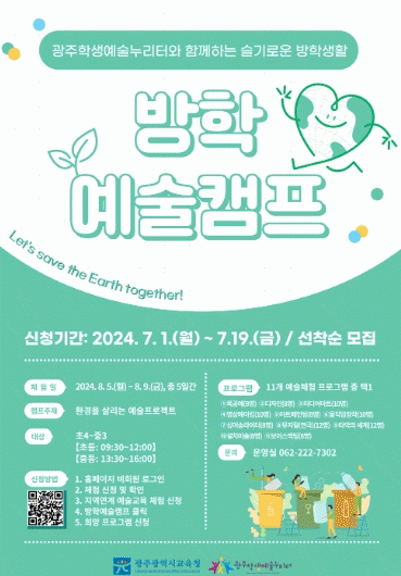 [¹Ìµð¾îÀü³² Á¦°¥´ëÁ¾ ±âÀÚ]±¤ÁÖÇлý¿¹¼ú´©¸®ÅͰ¡ Áö¿ª¿¬°è ¿¹¼úüÇè ÇÁ·Î±×·¥ ¡®¹æÇп¹¼úÄ·ÇÁ Let¡¯s save the Earth together¡¯¿¡ Âü¿©ÇÒ ÇлýÀ» ¸ðÁýÇÑ´Ù. ¹æÇп¹¼úÄ·ÇÁ´Â ¿À´Â 8¿ù 5ÀϺÎÅÍ 9ÀϱîÁö ¡®È¯°æÀ» »ì¸®´Â ¿¹¼úÇÁ·ÎÁ§Æ®¡¯¡¦