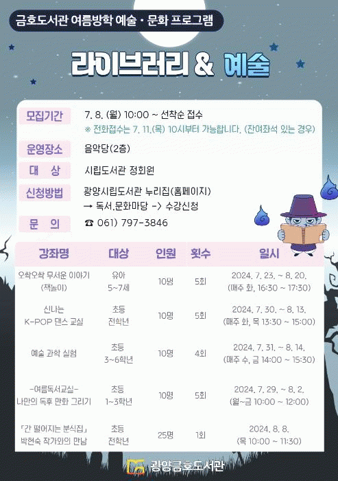 [¹Ìµð¾îÀü³² ÀÓ¼º¿Ï ±âÀÚ]±¤¾ç±ÝÈ£µµ¼°üÀÌ ¿À´Â 23ÀϺÎÅÍ 8¿ù 20ÀϱîÁö Áö¿ª ¾î¸°À̵éÀ» ´ë»óÀ¸·Î µ¶¼¿Í ¿¹¼ú¡¤¹®È¸¦ °áÇÕÇÑ ÇÁ·Î±×·¥ÀÎ'¶óÀ̺귯¸®¡¤¿¹¼ú'À» ¿î¿µÇÑ´Ù. ¿Ã ¿©¸§¹æÇп¡ ÁøÇàÇÏ´Â ÇÁ·Î±×·¥Àº ¿À½Ï¿À½ÏÇÑ °øÆ÷ À̾߱⸦¡¦
