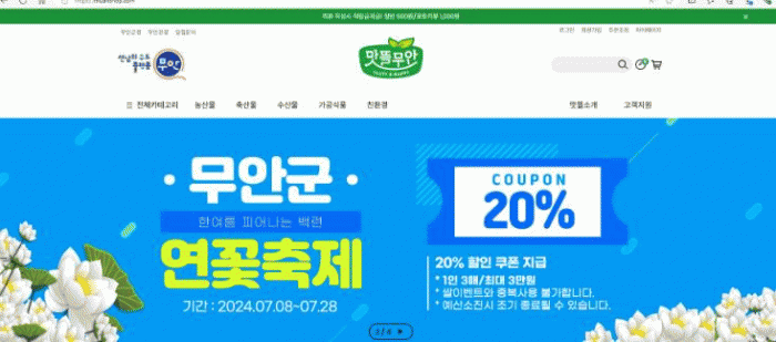 [¹Ìµð¾îÀü³² ±èÆÇ±¹ ±âÀÚ]Àü³² ¹«¾È±ºÀº Á¦27ȸ ¹«¾È¿¬²ÉÃàÁ¦¸¦ ±â³äÇØ ³óƯ»ê¹° ¿Â¶óÀÎ ¼îÇθô ¡®¸À¶ã¹«¾È¸ô¡¯¿¡¼ ÇÒÀÎÇà»ç¸¦ ÁøÇàÇÑ´Ù. ÇÒÀÎÇà»ç´Â 7¿ù 8ÀϺÎÅÍ 28ÀϱîÁö ¸À¶ã¹«¾È¸ô¿¡ ÀÔÁ¡ÇÑ Àü »óǰ¿¡ ´ëÇØ 20% ÇÒÀÎ ÄíÆùÀ» Áö±ÞÇÑ¡¦