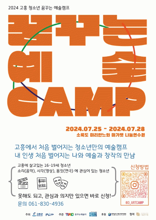 [¹Ìµð¾îÀü³² Á¦°¥´ëÁ¾ ±âÀÚ]°íÈﱺ°ú °íÈﱺ ¹®Èµµ½Ã¼¾ÅÍ´Â °íÈï ²Þ²Ù´Â ¿¹¼úÅÍ °³°ü Àü ½Ã¹ü ÇÁ·Î±×·¥À¸·Î °ü³» û¼Ò³âÀ» ´ë»óÀ¸·Î ¡®²Þ²Ù´Â ¿¹¼ú Ä·ÇÁ¡¯¸¦ ¿î¿µÇÑ´Ù°í ¹àÇû´Ù. À̹ø Ä·ÇÁ´Â 7¿ù 25ÀϺÎÅÍ 28ÀϱîÁö 3¹Ú 4ÀÏÀÇ ÀÏÁ¤À¸·Î¡¦