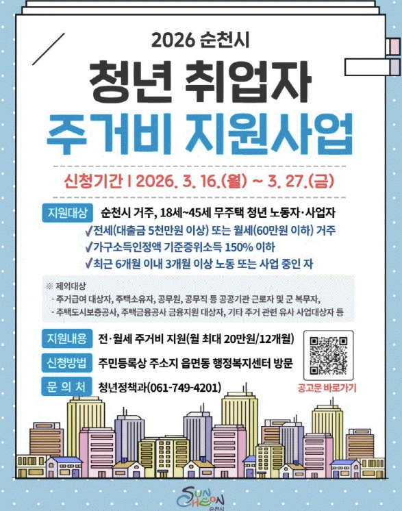 [¹Ìµð¾îÀü³² ÀÓ¼º¿Ï ±âÀÚ] ¼øÃµ½Ã´Â ¼º½ÇÈ÷ ÀÏÇϴ û³âÀÇ ÁÖ°Å ¾ÈÁ¤°ú °æÁ¦Àû ÀÚ¸³ ±â¹Ý ¸¶·ÃÀ» À§ÇØ'û³â Ãë¾÷ÀÚ Áְźñ Áö¿ø»ç¾÷' ´ë»óÀÚ¸¦ ¿À´Â 27ÀϱîÁö ¸ðÁýÇÑ´Ù. û³â Ãë¾÷ÀÚ Áְźñ Áö¿ø»ç¾÷Àº µµºñ°¡ Æ÷ÇÔµÈ »ç¾÷À¸·Î, Àü¡¤¿ù¼¼¡¦