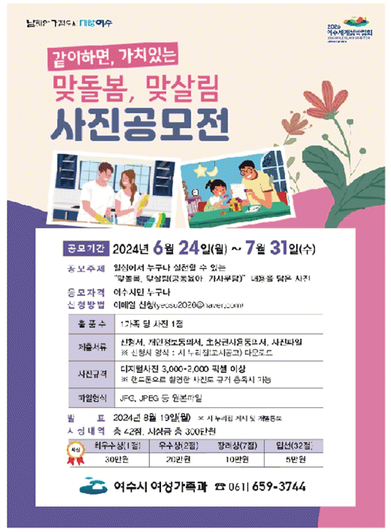 [¹Ìµð¾îÀü³² ÀüÇü¼º ±âÀÚ]¿©¼ö½Ã°¡ °¡Á¤ ³» ¾ç¼ºÆòµî ¹®È È®»êÀ» À§ÇØ °°ÀÌÇϸé, °¡Ä¡ÀÖ´Â ¡®¸Âµ¹º½, ¸Â»ì¸²¡¯ »çÁø °ø¸ðÀüÀ» °³ÃÖÇÑ´Ù. ¿ÃÇØ·Î 6ȸ°¸¦ ¸ÂÀÌÇÑ °ø¸ðÀüÀº Àϻ󿡼 ´©±¸³ª ½ÇõÇÒ ¼ö ÀÖ´Â °øµ¿À°¾Æ¿Í °¡»çºÐ´ã ³»¿ëÀÌ ¡¦
