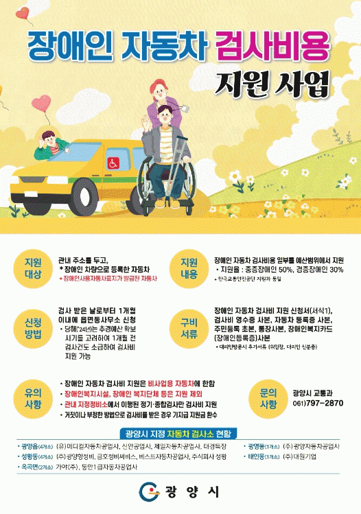 [¹Ìµð¾îÀü³² ÀÓ¼º¿Ï ±âÀÚ]Àü¶ó³²µµ ±¤¾ç½Ã°¡ Àå¾ÖÀο¡ ´ëÇÑ ÀÚµ¿Â÷ Á¤±â¡¤Á¾ÇÕ °Ë»çºñ¸¦ Áö¿øÇÑ´Ù. ÀÌ´Â ¡¸Àü¶ó³²µµ Àå¾ÖÀÎ ÀÚµ¿Â÷ °Ë»çºñ Áö¿ø Á¶·Ê¾È¡¹ Á¦Á¤¿¡ µû¸¥ °ÍÀ¸·Î ±âÁ¸¿¡ ¿©¼ö³ª ¼øÃµ µî Àα٠Áö¿ªÀÇ ±³Åë¾ÈÀü°ø´Ü °Ë»ç¼Ò¿¡ ¡¦