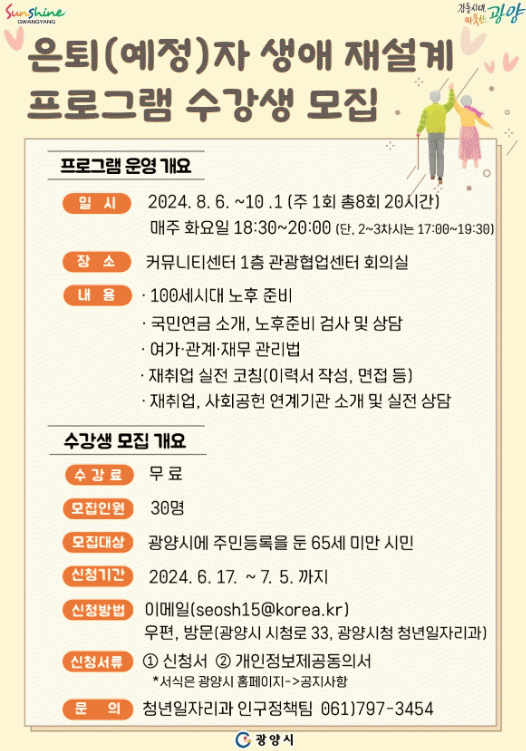 [¹Ìµð¾îÀü³² ÀÓ¼º¿Ï ±âÀÚ]±¤¾ç½Ã´Â ÀºÅð(¿¹Á¤)ÀÚµéÀÌ ¾ÈÁ¤ÀûÀÎ ³ëÈĸ¦ ÁغñÇÒ ¼ö ÀÖµµ·Ï 2024³â ÀºÅð(¿¹Á¤)ÀÚ »ý¾Ö Àç¼³°è ÇÁ·Î±×·¥À» ¿î¿µÇÑ´Ù°í ¹àÇû´Ù. ³ëÈÄ Áغñ ºÐ¾ßº° Àü¹® °»ç¸¦ ÃʺùÇØ ¡ã100¼¼½Ã´ë ³ëÈÄ Áغñ ¡ã³ëÈÄ Áغñ °Ë»ç¡¦