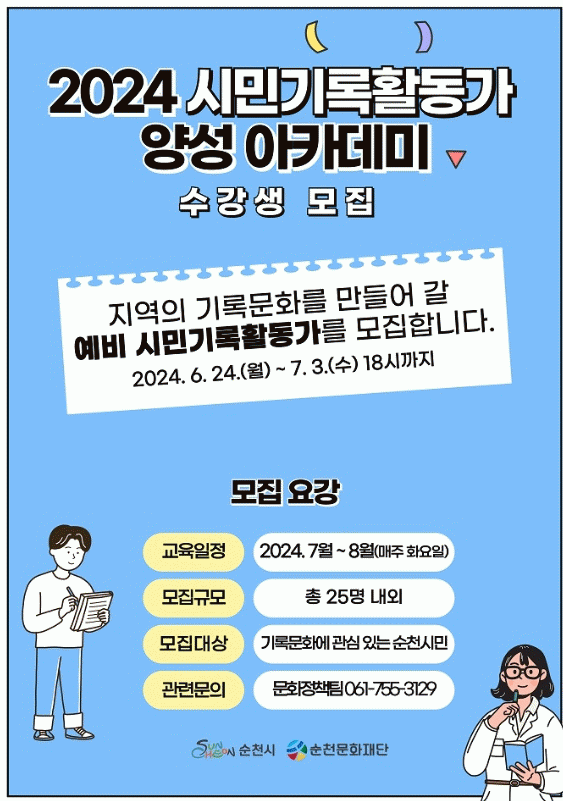 [¹Ìµð¾îÀü³² ÀÓ¼º¿Ï ±âÀÚ](Àç)¼øÃµ¹®ÈÀç´ÜÀº¡®2024 ½Ã¹Î±â·ÏȰµ¿°¡ ¾ç¼º ¾ÆÄ«µ¥¹Ì¡¯¼ö°»ýÀ» 7¿ù 3ÀϱîÁö °ø°³ ¸ðÁýÇÑ´Ù. ¡®2024 ½Ã¹Î±â·ÏȰµ¿°¡ ¾ç¼º ¾ÆÄ«µ¥¹Ì¡¯´Â ÀØÇô°¡´Â ¼øÃµ ¹Î°£ÀÚ·áÀÇ ±â·Ï¡¤¼öÁý¡¤º¸Á¸ ¹× ÁֹΠ»ýȰ»ç¿¡ °üÇÑ ¡¦