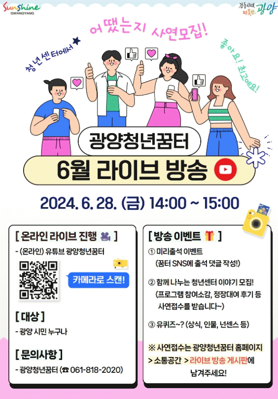 [¹Ìµð¾îÀü³² ÀÓ¼º¿Ï ±âÀÚ]±¤¾ç½Ã´Â ±¤¾çû³â²ÞÅ͸¦ Ȱ¼ºÈÇϰí û³âµé°ú ¼ÒÅëÀÇ ÀåÀ» ¸¶·ÃÇϱâ À§ÇØ ±¤¾çû³â²ÞÅÍ 6¿ù ¶óÀÌºê ¹æ¼ÛÀ» ÁøÇàÇÑ´Ù°í ¹àÇû´Ù. À̹ø ¶óÀÌºê ¹æ¼ÛÀº ¿À´Â 28ÀÏ ¿ÀÈÄ 2½ÃºÎÅÍ 3½Ã±îÁö ±¤¾çû³â²ÞÅÍ À¯Æ©ºê¸¦ ÅëÇØ¡¦
