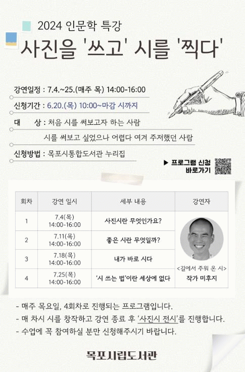 [¹Ìµð¾îÀü³² °í±Ô¼® ±âÀÚ]¸ñÆ÷½Ã¸³µµ¼°üÀÌ 2024 Àι®ÇÐ °¿¬ '»çÁøÀ» ¾²°í ½Ã¸¦ Âï´Ù'¸¦ ¿À´Â 7¿ù 4ÀϺÎÅÍ 25ÀϱîÁö ¸ÅÁÖ ¸ñ¿äÀÏ 4ȸ ¿î¿µÇÑ´Ù. °¿¬Àº ±æ°Å¸®¿¡ ¹ö·ÁÁö°í ¹æÄ¡µÈ °ÍµéÀ» »çÁøÀ¸·Î Âï°í ½Ã·Î ¾´ ¡®±æ¿¡¼ ÁÖ¿ö ¿Â ½Ã¡¯ÀÇ¡¦