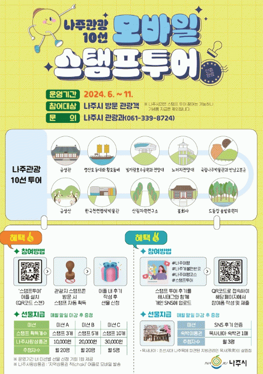 [¹Ìµð¾îÀü³² Á¦°¥´ëÁ¾ ±âÀÚ]Àü¶ó³²µµ ³ªÁֽð¡ ¿À´Â 11¿ù 30ÀϱîÁö ¡®³ªÁÖ°ü±¤ 10¼±¡¯À» ޹æÇÏ°í °æÇ°µµ ¹Þ¾Æ°¡´Â ¸ð¹ÙÀÏ ½ºÅÆÇÁ Åõ¾î À̺¥Æ®¸¦ ¿î¿µÇÑ´Ù. ½ºÅÆÇÁÅõ¾î(stamp tour)¶õ ƯÁ¤ ¿©ÇàÁö¸¦ µ¹¾Æ´Ù´Ï¸ç µµÀåÀ» Âï´Â °ü±¤ »óǰ¡¦