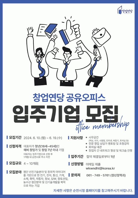 [¹Ìµð¾îÀü³² ÀÓ¼º¿Ï ±âÀÚ]¼øÃµ½Ã´Â ¿À´Â 19ÀϱîÁö â¾÷¿¬´ç ÀÔÁÖ±â¾÷À» ¸ðÁýÇÑ´Ù°í ¹àÇû´Ù. â¾÷¿¬´çÀº ¡®Ã¢¾÷ÀÇ ¹®À» ¿¬´Ù¡¯, ¡®Ã¢¾÷ÀÇ ¹®À» ¿©´Â Áý¡¯À̶ó´Â Àǹ̷ΠÁö¿ª û³âµéÀÇ Ã¢¾÷À» µ½±â À§ÇØ Áö³ 2020³âºÎÅÍ ¿î¿µ ÁßÀÌ´Ù. Çö¡¦