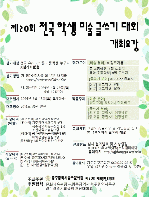 [¹Ìµð¾îÀü³² ±èÁ¤¿ì ±âÀÚ]±¤ÁÖ µ¿±¸°¡ ÁÖÃÖÇÏ´Â Á¦20ȸ Àü±¹Çлý¹Ì¼ú¡¤±Û¾²±â ´ëȸ°¡ ¿À´Â 15ÀÏ ¿ÀÈÄ 2½Ã ±Ý³²·Î °ø¿ø¿¡¼ ¿¸°´Ù. ¹®ÈüÀ°°ü±¤ºÎ°¡ ÈÄ¿øÇÏ°í ±¤ÁÖ±¤¿ª½Ã µ¿±¸¹®È¿øÀÌ ÁÖ°üÇÏ´Â À̹ø ´ëȸ´Â Àڶ󳪴 û¼Ò³âµé¿¡°Ô ±×¸²¡¦
