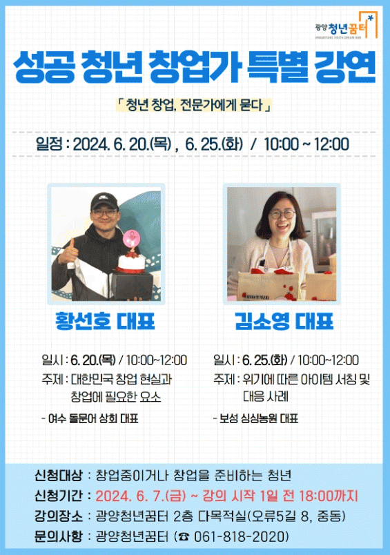 [¹Ìµð¾îÀü³² ÀÓ¼º¿Ï ±âÀÚ]±¤¾ç½Ã´Â ±¤¾çû³â²ÞÅÍ(¿À·ù5±æ 8)¿¡¼ 6¿ù û³â¿ª·® °È ÇÁ·Î±×·¥ ¡®Ã»³â â¾÷, Àü¹®°¡¿¡°Ô ¹¯´Ù¡¯ Ưº° °¿¬À» ÁøÇàÇÑ´Ù°í 10ÀÏ ¹àÇû´Ù. À̹ø Ưº° °¿¬Àº ¿À´Â 20ÀÏ ¸ñ¿äÀϰú 25ÀÏ È¿äÀÏ ¿ÀÀü 10½Ã¿¡ 2ȸ¿¡¡¦