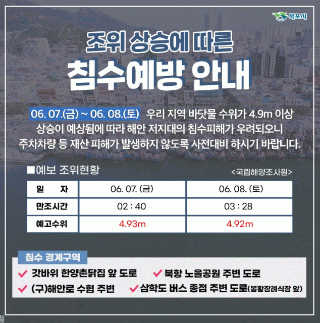 [¹Ìµð¾îÀü³² °í±Ô¼® ±âÀÚ]¸ñÆ÷½Ã´Â ´ëÁ¶±âÀÎ ¿À´Â 7ÀÏ ºÎÅÍ 8ÀÏ(»õº® 1½Ã ºÎÅÍ 5½Ã) »çÀÌ ¹Ù´å¹° ¼öÀ§°¡ 4.9m ÀÌ»ó (Á¶¼®Ç¥»ó 6/7 ÃÖ°í 4.93m) »ó½Â ¿¹»óµÊ¿¡ µû¶ó ÇÇÇØ¸¦ ÀÔÁö ¾Êµµ·Ï öÀúÇÑ ´ëºñ¸¦ ´çºÎÇß´Ù. ¸ñÆ÷½Ã´Â ºñ»ó±Ù¹«¹ÝÀ»¡¦