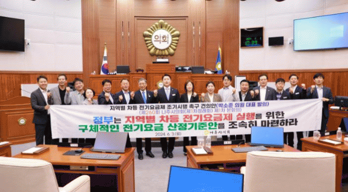 [¹Ìµð¾îÀü³² Á¦°¥´ëÁ¾ ±âÀÚ]³ªÁÖ½ÃÀÇȸ´Â 6¿ù 3ÀÏ ¿¸° ³ªÁÖ½ÃÀÇȸ Á¦260ȸ Á¦1Â÷ Á¤·Êȸ Á¦1Â÷ º»È¸ÀÇ¿¡¼ ¡°Áö¿ªº° Â÷µî Àü±â¿ä±ÝÁ¦ Á¶±â½ÃÇà Ã˱¸ °ÇÀǾȡ±À» ÀǰáÇß´Ù°í ¹àÇû´Ù. ³ªÁÖ½ÃÀÇȸ´Â À̹ø °ÇÀǾÈÀ» ÅëÇØ ¡ã±¸Ã¼ÀûÀÎ Àü±â¿ä¡¦