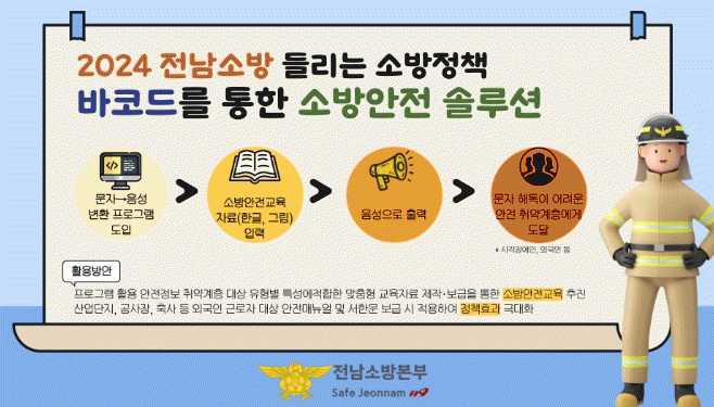 [¹Ìµð¾îÀü³² °í±Ô¼® ±âÀÚ]°Áø¼Ò¹æ¼´Â º½Ã¶ ¼Ò¹æ¾ÈÀü´ëÃ¥ÀÇ ÀÏȯÀ¸·Î ¡°µé¸®´Â ¼Ò¹æÁ¤Ã¥! ¹ÙÄڵ带 ÅëÇÑ ¼Ò¹æ¾ÈÀü ¼Ö·ç¼Ç¡±À» ÃßÁøÇÑ´Ù°í 27ÀÏ ¹àÇû´Ù. À̹ø ¼Ö·ç¼ÇÀº ½Ã°¢Àå¾ÖÀÎ, ¿Ü±¹ÀÎ µî ¹®ÀÚ ÇØµ¶ÀÌ ¾î·Á¿î ¾ÈÀü Ãë¾à°èÃþÀ» ´ë»óÀ¸¡¦