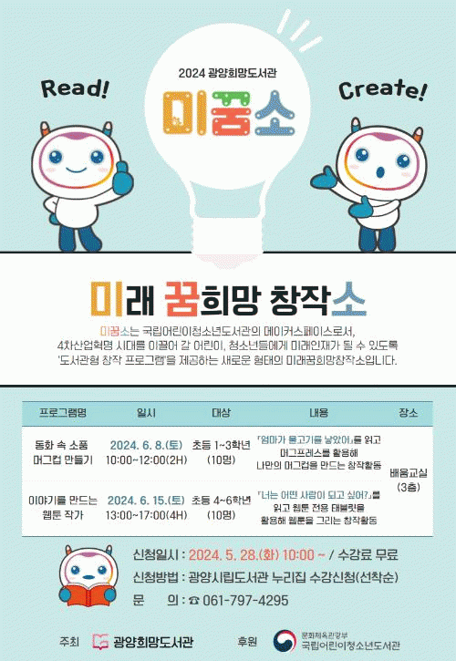 [¹Ìµð¾îÀü³² ÀÓ¼º¿Ï ±âÀÚ]±¤¾çÈñ¸Áµµ¼°üÀÌ ¿À´Â 6¿ù 8Àϰú 15ÀÏ, ÃʵîÇлýÀ» ´ë»óÀ¸·Î µµ¼°üÇü âÀÛ ÇÁ·Î±×·¥ÀÎ ¹Ì·¡²ÞÈñ¸ÁâÀÛ¼Ò ÇÁ·Î±×·¥À» ¿î¿µÇÑ´Ù°í ¹àÇû´Ù. ¡®¹Ì²Þ¼Ò¡¯´Â ±¹¸³¾î¸°ÀÌû¼Ò³âµµ¼°üÀÇ ´ëÇ¥ ºê·£µå·Î µ¶¼¿¡ âÀÛȰ¡¦