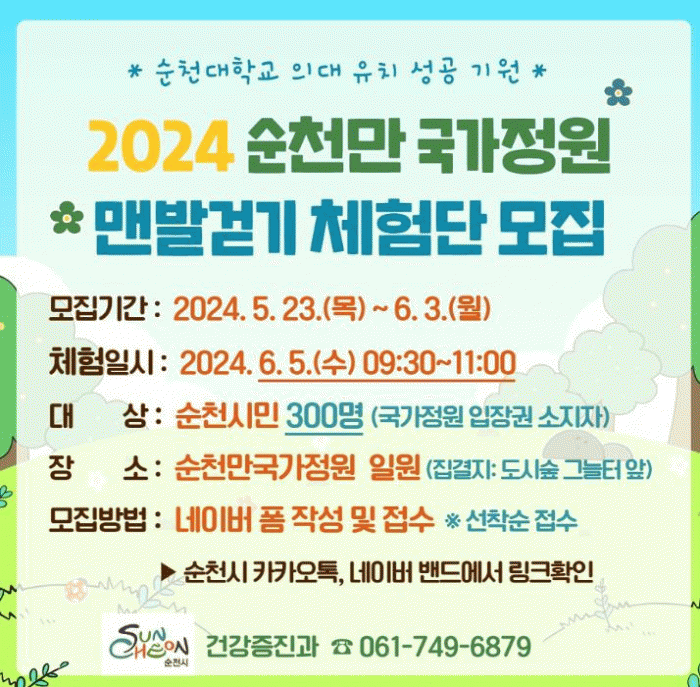 [¹Ìµð¾îÀü³² ÀÓ¼º¿Ï ±âÀÚ]¼øÃµ½Ã´Â ¼øÃµ´ë ÀÇ´ë À¯Ä¡ ¼º°øÀ» ±â¿øÇϸç 6¿ù 5ÀÏ °³ÃÖÇÏ´Â ¼øÃµ¸¸±¹°¡Á¤¿ø ¸Ç¹ß°È±â±æ üÇè Çà»ç¿¡ Âü¿©ÇÒ ½Ã¹Î 300¸íÀ» ¼±Âø¼ø ¸ðÁýÇÑ´Ù°í ¹àÇû´Ù. À̹ø Çà»ç´Â ¼øÃµ´ë ÀÇ´ëÀ¯Ä¡ ¼º°ø±â¿ø ½Ã¹Î ÆÛÆ÷¸Õ½º, ¡¦