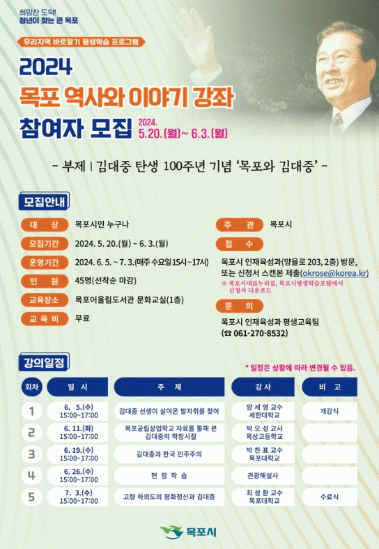 [¹Ìµð¾îÀü³² °í±Ô¼® ±âÀÚ]¸ñÆ÷½Ã´Â ¿ì¸®Áö¿ª ¹Ù·Î¾Ë±â Æò»ýÇнÀ ÇÁ·Î±×·¥ÀÎ ¡°¸ñÆ÷ ¿ª»ç¿Í À̾߱⡱¿¡ Âü¿©ÇÒ ¼ö°»ýÀ» ¸ðÁýÇÑ´Ù. ÀÌ °Á´ Áö¿ª Àü¹®°¡µéÀÇ ´Ù¾çÇÑ °ÀǸ¦ ÅëÇØ ¸ñÆ÷ÀÇ ¿ª»ç¿Í ¹®È, ¿¹¼ú µî ½Ã¿¡ »êÀçÇÑ ±Ù´ë¹®ÈÀ¯»ê¡¦