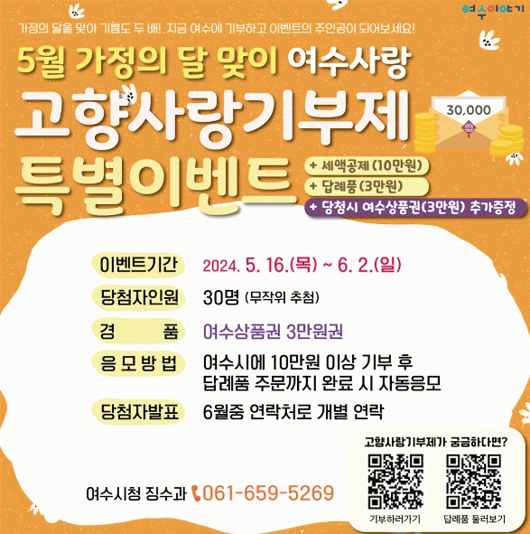 [¹Ìµð¾îÀü³² ÀüÇü¼º ±âÀÚ]¿©¼ö½Ã°¡ 5¿ù °¡Á¤ÀÇ ´ÞÀ» ¸Â¾Æ ¿À´Â 6¿ù 2ÀϱîÁö ¡®¿©¼ö»ç¶û °íÇâ»ç¶û±âºÎÁ¦ Ưº° À̺¥Æ®¡¯¸¦ ÁøÇàÇÑ´Ù. À̺¥Æ®´Â 10¸¸ ¿ø ÀÌ»ó °íÇâ»ç¶û ±âºÎÀÚ¸¦ ´ë»óÀ¸·Î 30¸íÀ» ÃßÃ·ÇØ ¿©¼ö»óǰ±Ç 3¸¸¿øÀ» Ãß°¡·Î Á¦°øÇϴ¡¦