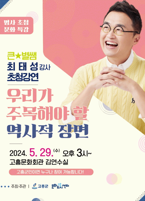 [¹Ìµð¾îÀü³² Á¦°¥´ëÁ¾ ±âÀÚ]°íÈﱺÀº ¿À´Â 5¿ù 29ÀÏ ¼ö¿äÀÏ ¿ÀÈÄ 3½Ã °íÈï Á¾ÇÕ¹®Èȸ°ü ±è¿¬¼ö½Ç¿¡¼ ±º¹ÎÀÇ Àι®ÇÐÀû ¼Ò¾ç ÇÔ¾çÀ» À§ÇØ ¹®ÈƯ°À» °³ÃÖÇÑ´Ù°í ¹àÇû´Ù. À̹ø Ư°Àº Çѱ¹»ç ÀÏŸ°»ç·Î ²ÅÈ÷´Â ¡®Å«º°½Ü¡¯ ÃÖżº °»ç¸¦¡¦