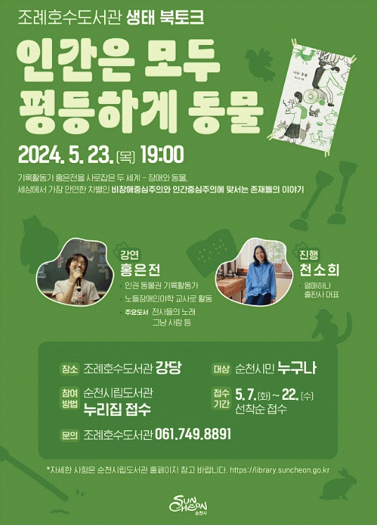 [¹Ìµð¾îÀü³² ÀÓ¼º¿Ï ±âÀÚ]¼øÃµ½Ã´Â ¿À´Â 23ÀÏ Àú³á 7½Ã Á¶·ÊÈ£¼öµµ¼°ü¿¡¼¡¶³ª´Â µ¿¹°¡·À» ¾´ È«ÀºÀü ÀÛ°¡ÀÇ »ýÅ ºÏ ÅäÅ©¸¦ °³ÃÖÇÑ´Ù°í ¹àÇû´Ù. À̹ø ºÏ ÅäÅ©´Â ¡®Àΰ£Àº ¸ðµÎ ÆòµîÇÏ°Ô µ¿¹°¡¯À̶ó´Â ÁÖÁ¦·Î, ¡®ÁÁÀº µ¿¹°¡¯ÀÌ µÇ°í ½Í¡¦