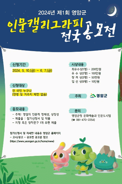[¹Ìµð¾îÀü³² °í±Ô¼® ±âÀÚ]¿µ¾Ï±ºÀÌ ¡®2024³â Á¦1ȸ ¿µ¾Ï Àι® Ķ¸®±×¶óÇÇ Àü±¹ °ø¸ðÀü¡¯ Á¢¼ö¸¦ 6/7ÀϱîÁö ½Ç½ÃÇÑ´Ù. À̹ø °ø¸ðÀüÀº ¿µ¾Ï±º À¯¡¤¹«ÇüÀÇ ¿ª»ç¡¤¹®È ÀÚ»êÀ» È«º¸Çϱâ À§ÇÑ °ÍÀ¸·Î, ±¹¹ÎÀÎ °³ÀÎ ´©±¸³ª Âü¿©ÇÒ ¼ö ÀÖ´Ù. °ø¡¦