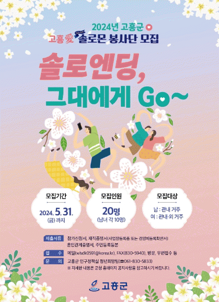 [¹Ìµð¾îÀü³² Á¦°¥´ëÁ¾ ±âÀÚ]°íÈﱺÀº ¹ÌÈ¥³²³à Àο¬ ¸Î±â¸¦ À§ÇÑ ¡®°íÈï¼Ö·Î¿£µù, ±×´ë¿¡°Ô GO~¡¯¿¡ Âü°¡¸¦ Èñ¸ÁÇÏ´Â ³²¡¤¿© 20¸íÀ» ¿À´Â 5¿ù 31ÀϱîÁö ¸ðÁýÇÑ´Ù°í ¹àÇû´Ù. ¡®°íÈï¼Ö·Î¿£µù, ±×´ë¿¡°Ô GO~¡¯´Â ¸¸³²ÀÇ ±âȸ°¡ ºÎÁ·Çß´ø ¹Ì¡¦