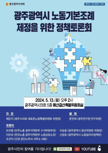 [¹Ìµð¾îÀü³² Á¦°¥´ëÁ¾ ±âÀÚ]±¤ÁÖ±¤¿ª½Ã¿¡ ³ëµ¿ÀÚÀÇ ±Ç¸®º¸ÀåÀ» ´ãÀº ³ëµ¿±âº»Á¶·Ê°¡ Á¦Á¤µÉ Àü¸ÁÀÌ´Ù. äÀºÁö ±¤ÁÖ±¤¿ª½ÃÀÇȸ »õ·Î¿î³ëµ¿Æ¯À§ À§¿øÀåÀº ¡®±¤ÁÖ±¤¿ª½Ã ³ëµ¿±âº»Á¶·Ê¡¯°¡ 6¿ù Áß¿¡ ÀÔ¹ýµÉ ¼ö ÀÖµµ·Ï Áغñ ÁßÀ̸ç À̸¦ À§ÇØ¡¦