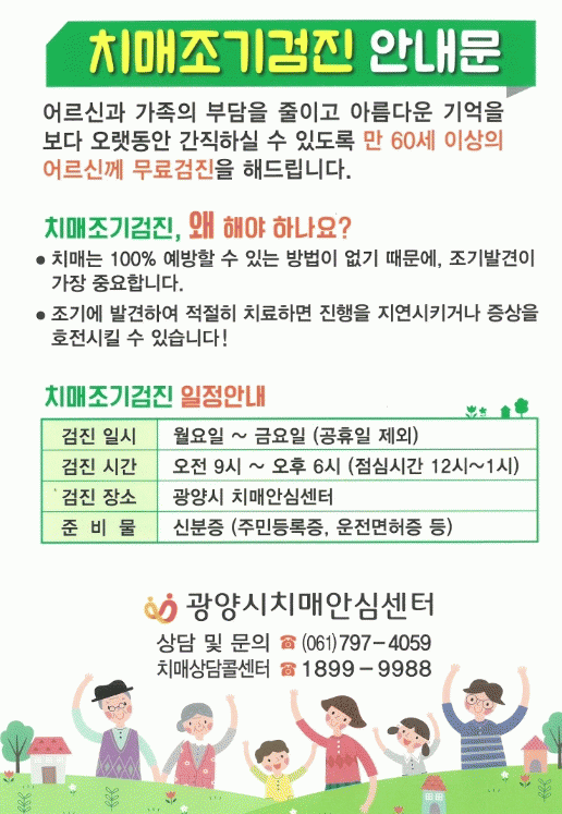 [¹Ìµð¾îÀü³² ÀÓ¼º¿Ï ±âÀÚ]±¤¾ç½ÃÄ¡¸Å¾È½É¼¾ÅÍ´Â °¡Á¤ÀÇ ´Þ 5¿ù Ä¡¸Å¸¦ Á¶±â¿¡ ¹ß°ßÇØ Àû±â¿¡ Ä¡·á¸¦ ¹ÞÀ» ¼ö ÀÖµµ·Ï 60¼¼ ÀÌ»ó ½Ã¹ÎÀ» ´ë»óÀ¸·Î ¡®Ä¡¸ÅÁ¶±â°ËÁø¡¯À» ½Ç½ÃÇÑ´Ù°í 9ÀÏ ¹àÇû´Ù. ¼¾ÅÍ´Â 3°³³â(¡¯23 ºÎÅÍ ¡¯25³â)¿¡ °ÉÃÄ 60¼¼¡¦