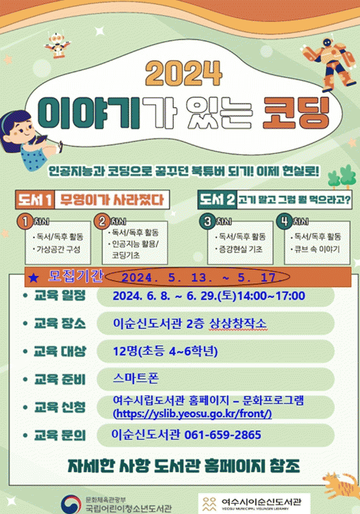 [¹Ìµð¾îÀü³² ÀüÇü¼º ±âÀÚ]¿©¼ö½Ã À̼ø½Åµµ¼°üÀÌ ¿À´Â 13ÀϺÎÅÍ ¡®À̾߱Ⱑ ÀÖ´Â ÄÚµù¡¯ Âü¿©ÀÚ 12¸íÀ» ¼±Âø¼ø ¸ðÁýÇÑ´Ù. ¡®À̾߱Ⱑ ÀÖ´Â ÄÚµù¡¯Àº ÃʵîÇб³ 4 ºÎÅÍ 6ÇгâÀ» ´ë»óÀ¸·Î Ã¥ Àбâ¿Í µðÁöÅÐ ±â¼úÀÌ À¶ÇÕµÈ ÄÚµù±³À°À¸·Î, ´Ù¡¦