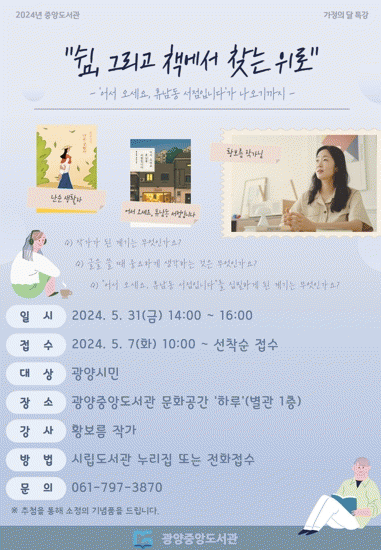 [¹Ìµð¾îÀü³² ÀÓ¼º¿Ï ±âÀÚ]±¤¾çÁß¾Óµµ¼°üÀº ¿À´Â 31ÀÏ ¿ÀÈÄ 2½Ã ¹®È°ø°£ ¡®ÇϷ硯¿¡¼ ¡®½°, ±×¸®°í Ã¥¿¡¼ ã´Â À§·Î¡¯¸¦ ÁÖÁ¦·Î 'Ȳº¸¸§ ÀÛ°¡ ÃÊû °¿¬'À» ¿î¿µÇÑ´Ù. À̹ø °¿¬Àº °¡Á¤ÀÇ ´ÞÀ» ¸ÂÀÌÇØ Àü LGÀüÀÚ ¼ÒÇÁÆ®¿þ¾î °³¹ßÀÚ¿´¡¦