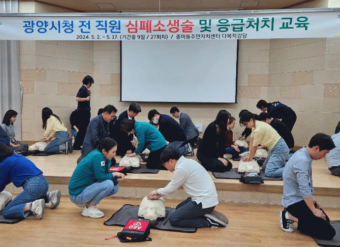 [¹Ìµð¾îÀü³² ÀÓ¼º¿Ï ±âÀÚ]±¤¾ç½Ã°¡ ÀÌ´Þ 2ÀϺÎÅÍ 17ÀϱîÁö Á߸¶µ¿ ÁÖ¹ÎÀÚÄ¡¼¾ÅÍ¿Í ±¤¾ç½Ãº¸°Ç¼Ò ´Ù¸ñÀû½Ç¿¡¼ Àü Á÷¿ø ´ë»ó ½ÉÆó¼Ò»ý¼ú ¹× ÀÀ±Þóġ ±³À°À» ÇÑ´Ù°í ¹àÇû´Ù. ½ÉÆó¼Ò»ý¼ú(Cardiopulmonary Resuscitation, CPR)Àº ½ÉÀå ¸¶ºñ¡¦