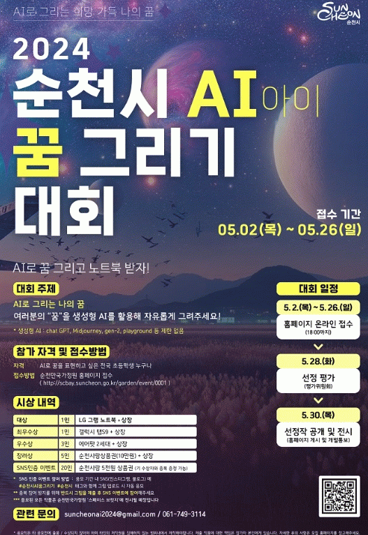 [¹Ìµð¾îÀü³² ÀÓ¼º¿Ï ±âÀÚ]¼øÃµ½Ã´Â Àü±¹ ÃʵîÇлýÀ» ´ë»óÀ¸·Î 5¿ù 2ÀϺÎÅÍ 26ÀϱîÁö'2024 ¼øÃµ½Ã AI(¾ÆÀÌ) ²Þ ±×¸®±â ´ëȸ'¸¦ ¿¬´Ù°í ¹àÇû´Ù. À̹ø ´ëȸ´Â µðÁöÅÐ ±â¼úÀ» Ȱ¿ëÇØ Àçź»ýÇÑ ¼øÃµ¸¸±¹°¡Á¤¿ø ¡®½ºÆäÀ̽º ºê¸´Áö¡¯¿¡ Àü½ÃÇÒ ¡¦